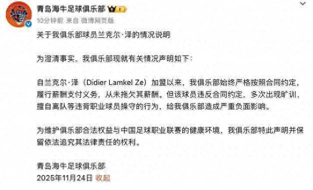 北京时辰11月24日晚,中超青岛海牛俱乐部官方发文,复兴了对于外助兰克尔-泽的欠薪指控。原文如下: